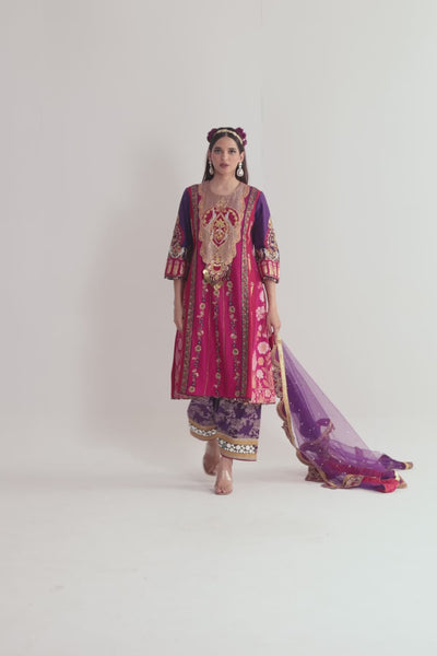 Double layer embroidered dupion silk kurta paired with an dupion silk pants comes with muakish net dupatta