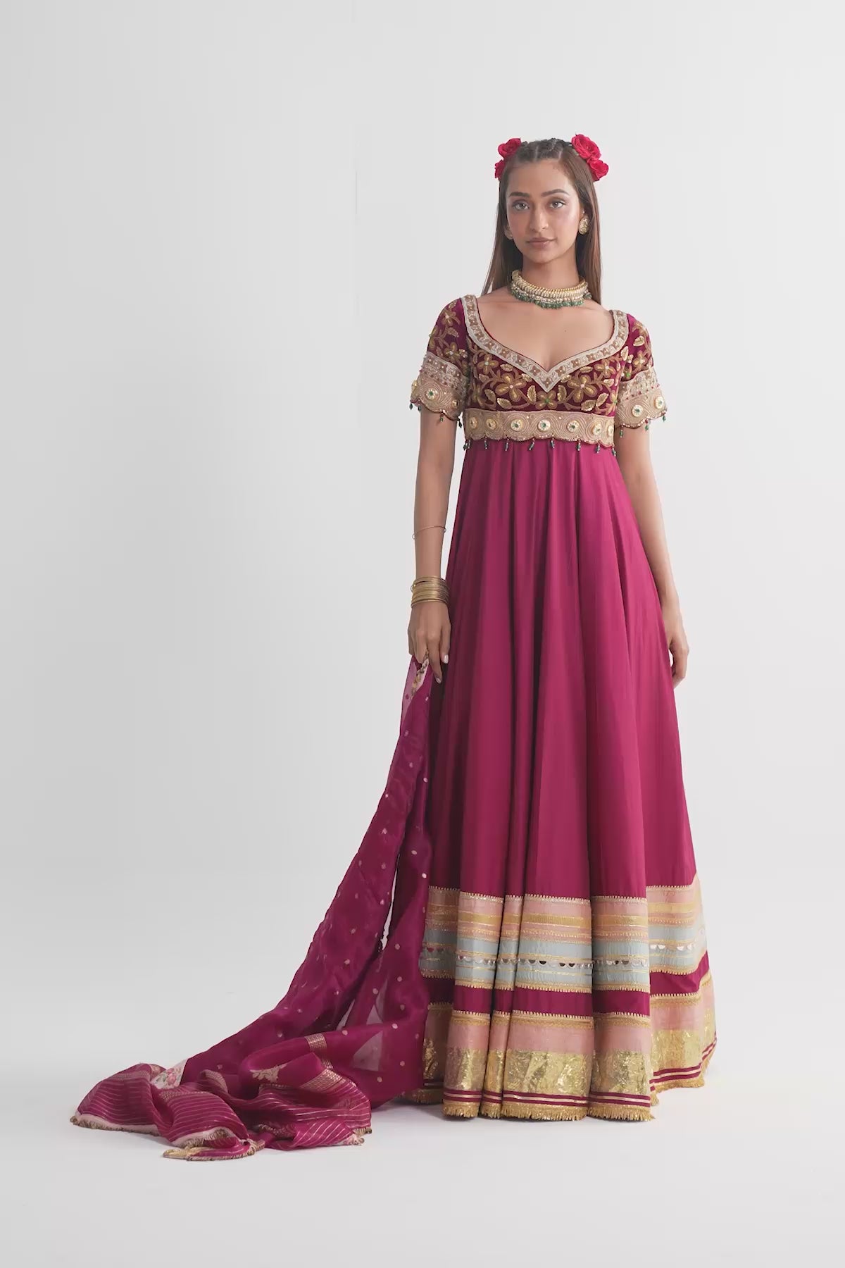 Mulmul Anarkali with velvet embroidered yoke detailing, paired with an organza dupatta
