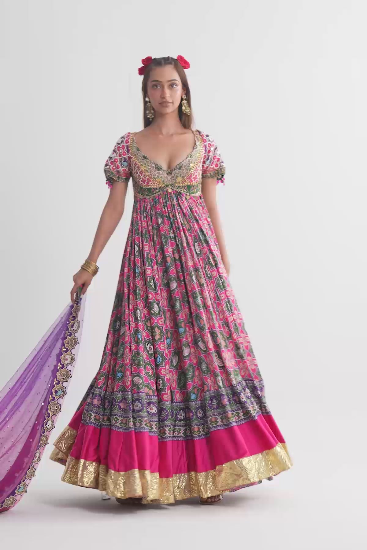Printed mulmul and dupion silk anarkali paired with an mukaish net dupatta