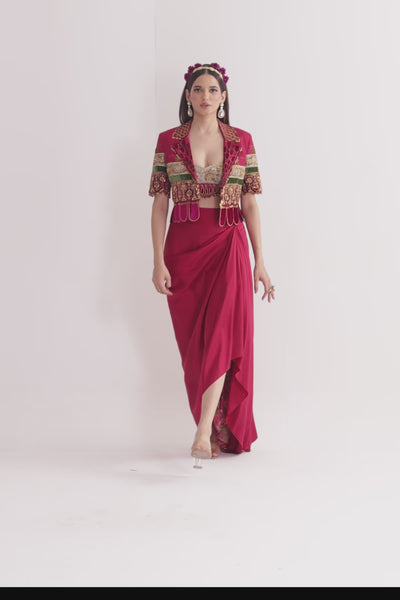 Dupion silk crop blazer skirt set with embroidered blazer and bustier, paired with a drape skirt