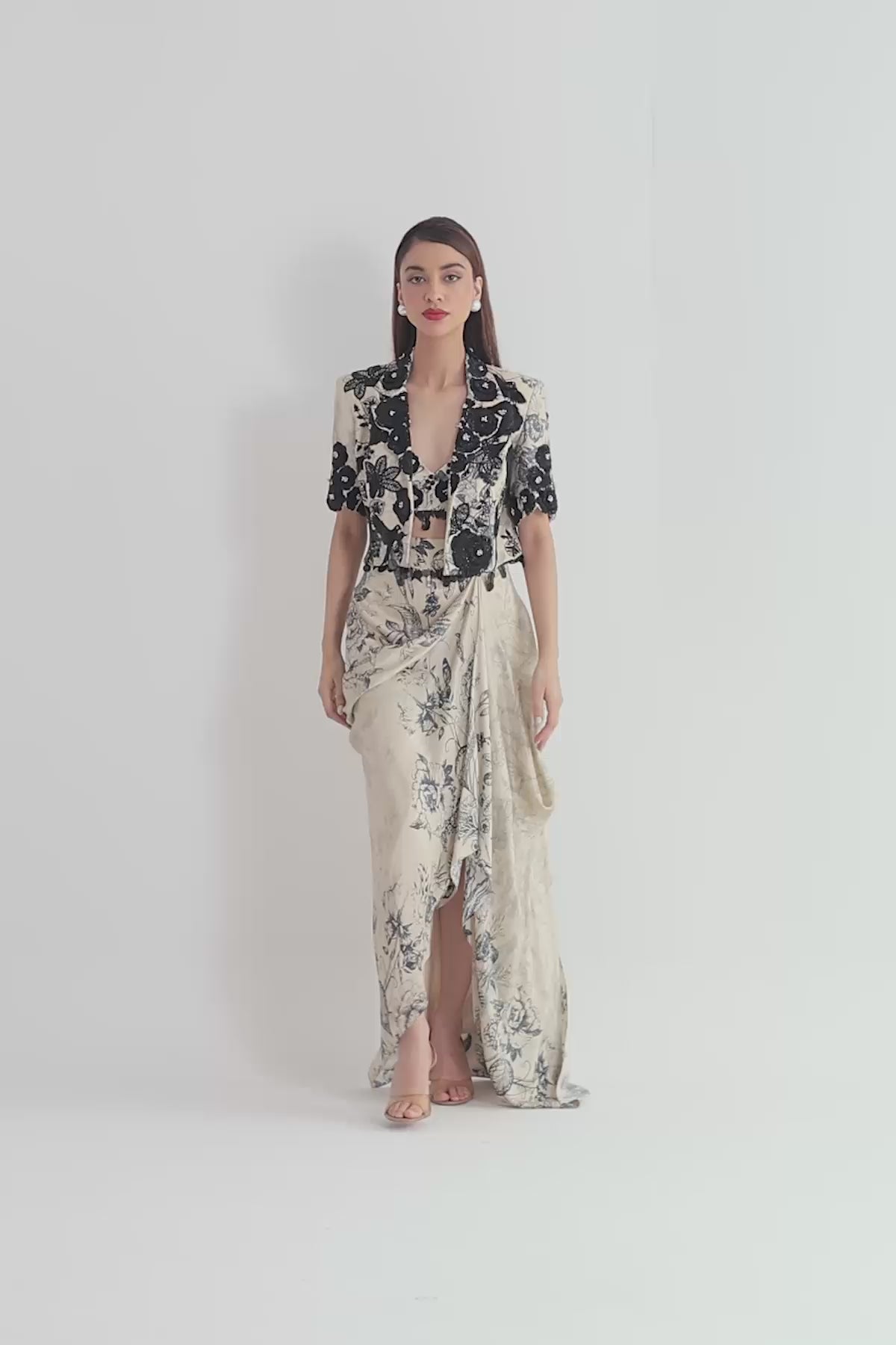 Embroidered silk crop blazer paired up with beige embroidered bustier and printed silk drape skirt