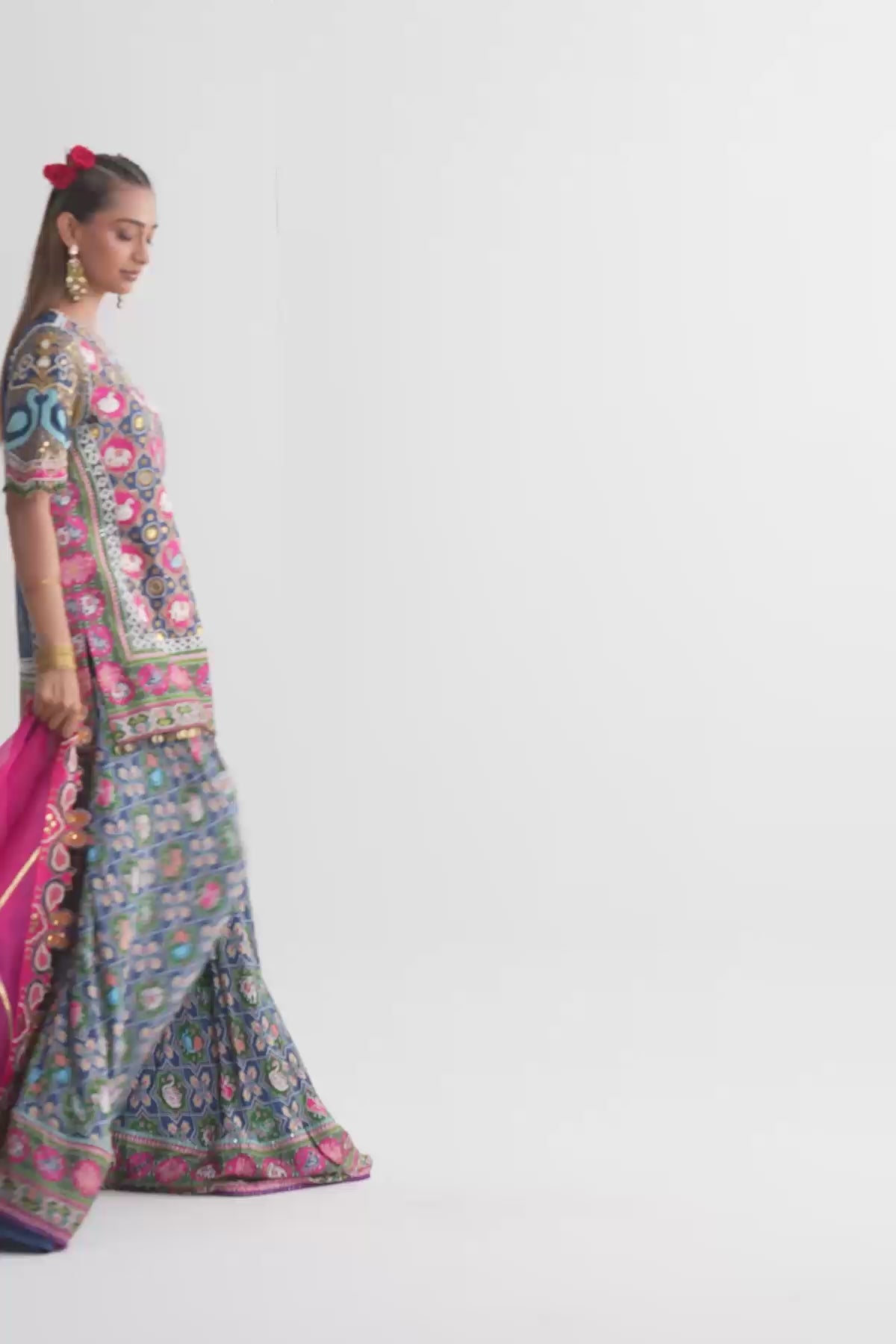 Printed dupion silk and mulmul kurta paired with an printed mulmul sharara comes with organza dupatta