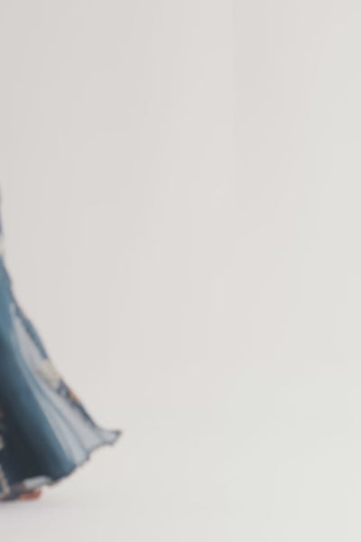 Embroidered silk jumpsuit paired with organza embroidered drape