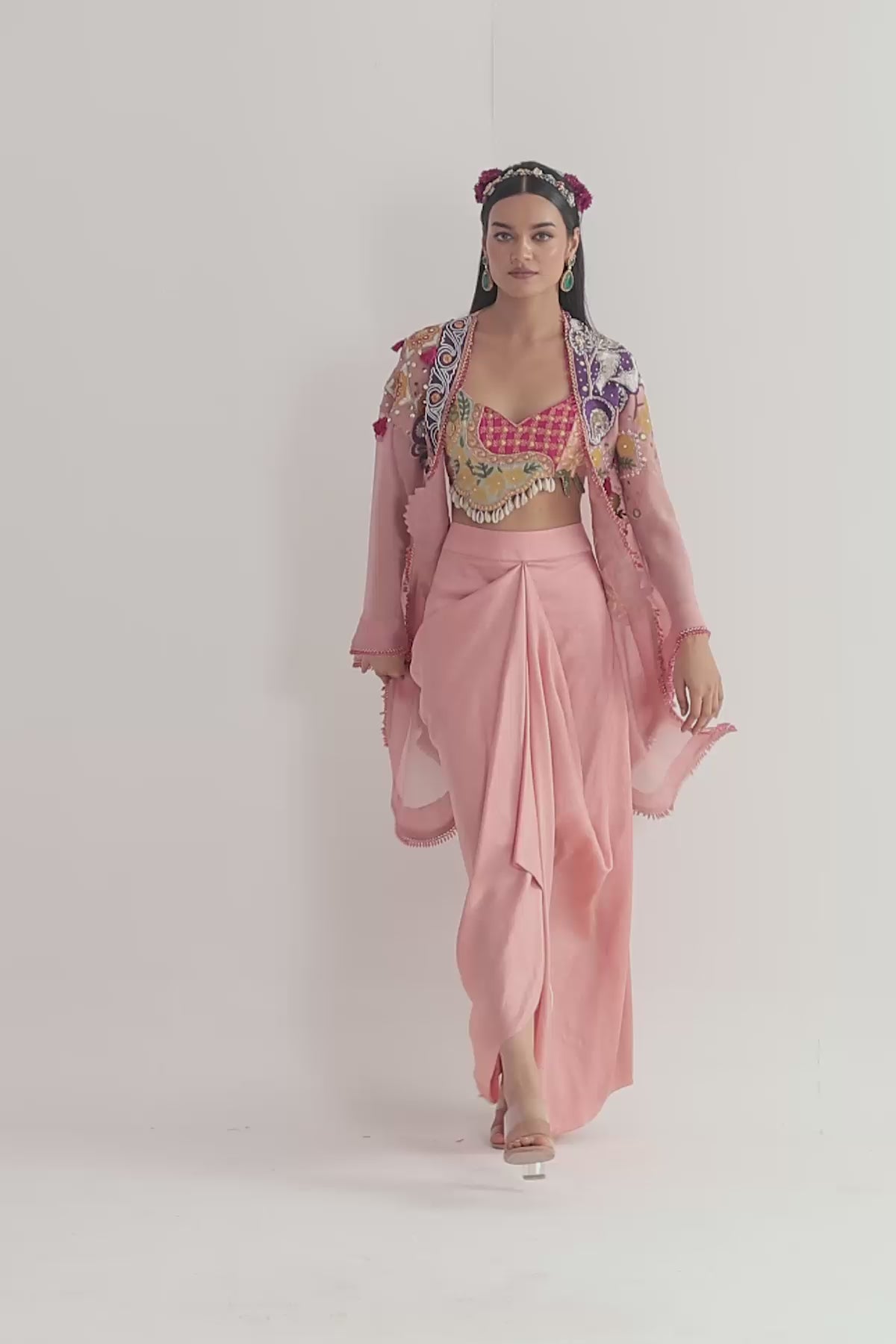 Organza cape highlighted with hand embroidery paired with an embroidered silk bustier and silk drape skirt