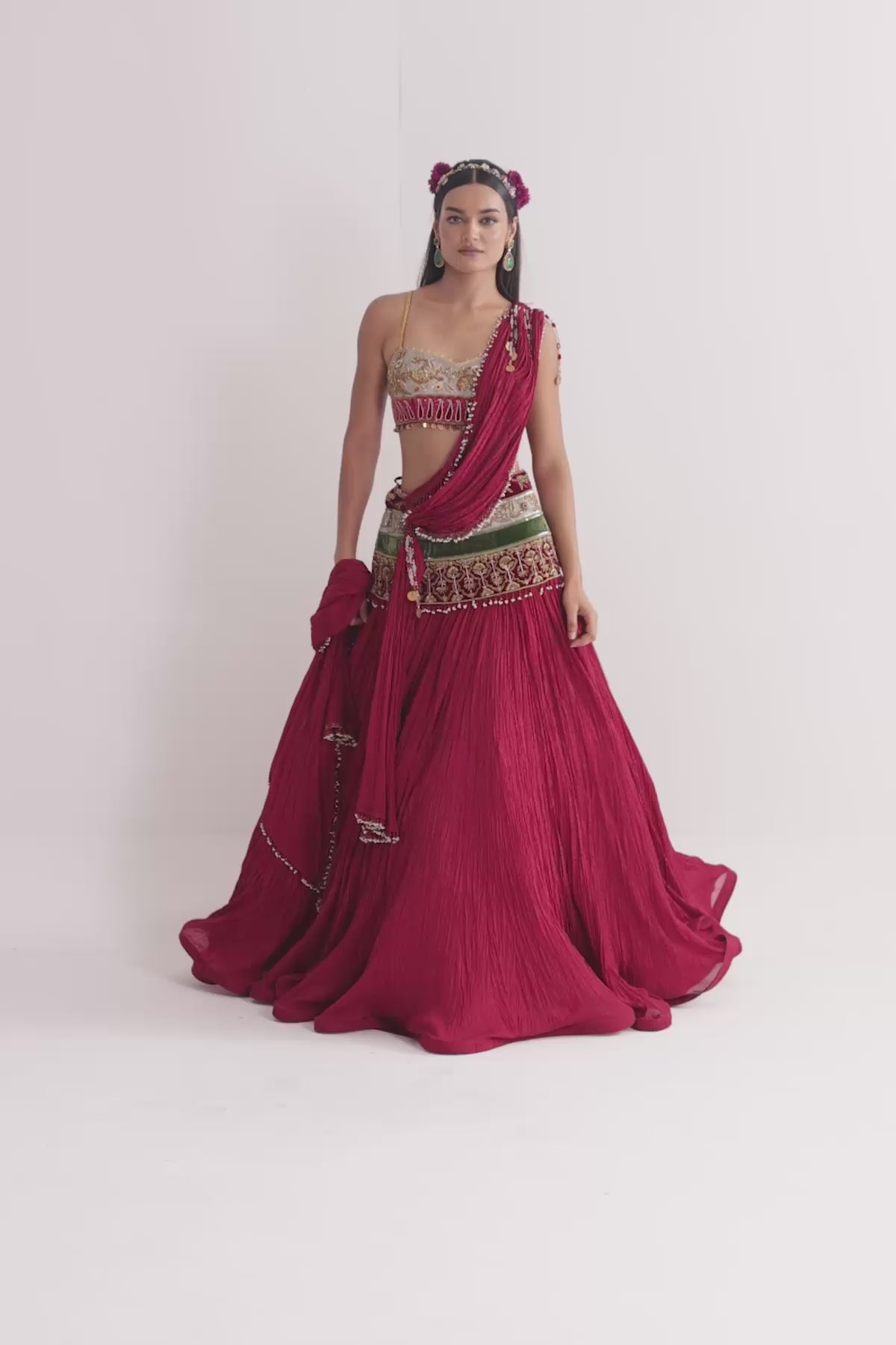 Crushed tabby silk lehenga paired with a velvet embroidered blouse and matching crushed tabby silk dupatta
