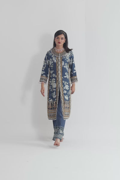 Printed and embroidered dupion silk long jacket paired with plain dupion silk pants featuring an embroidered border