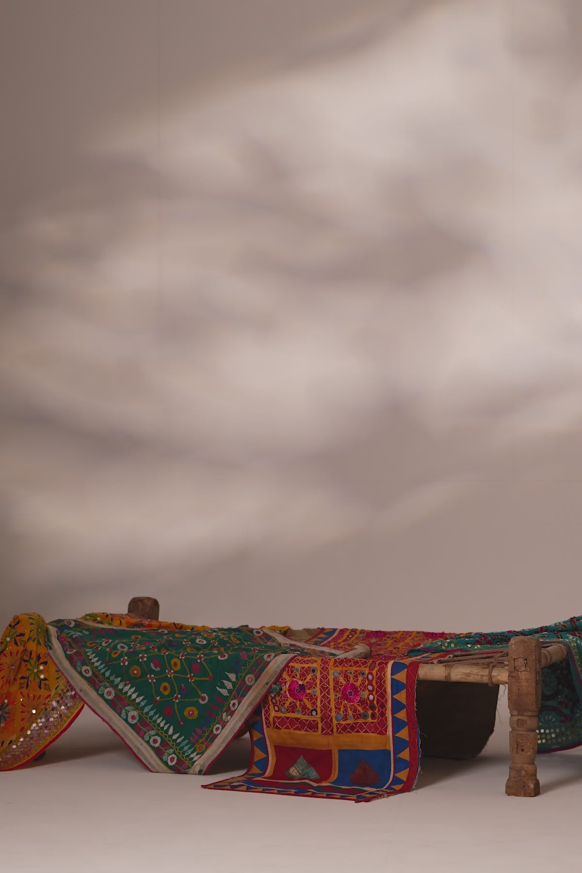 Embroidered silk long jacket paired up with printed mulmul drape skirt comes with bustier