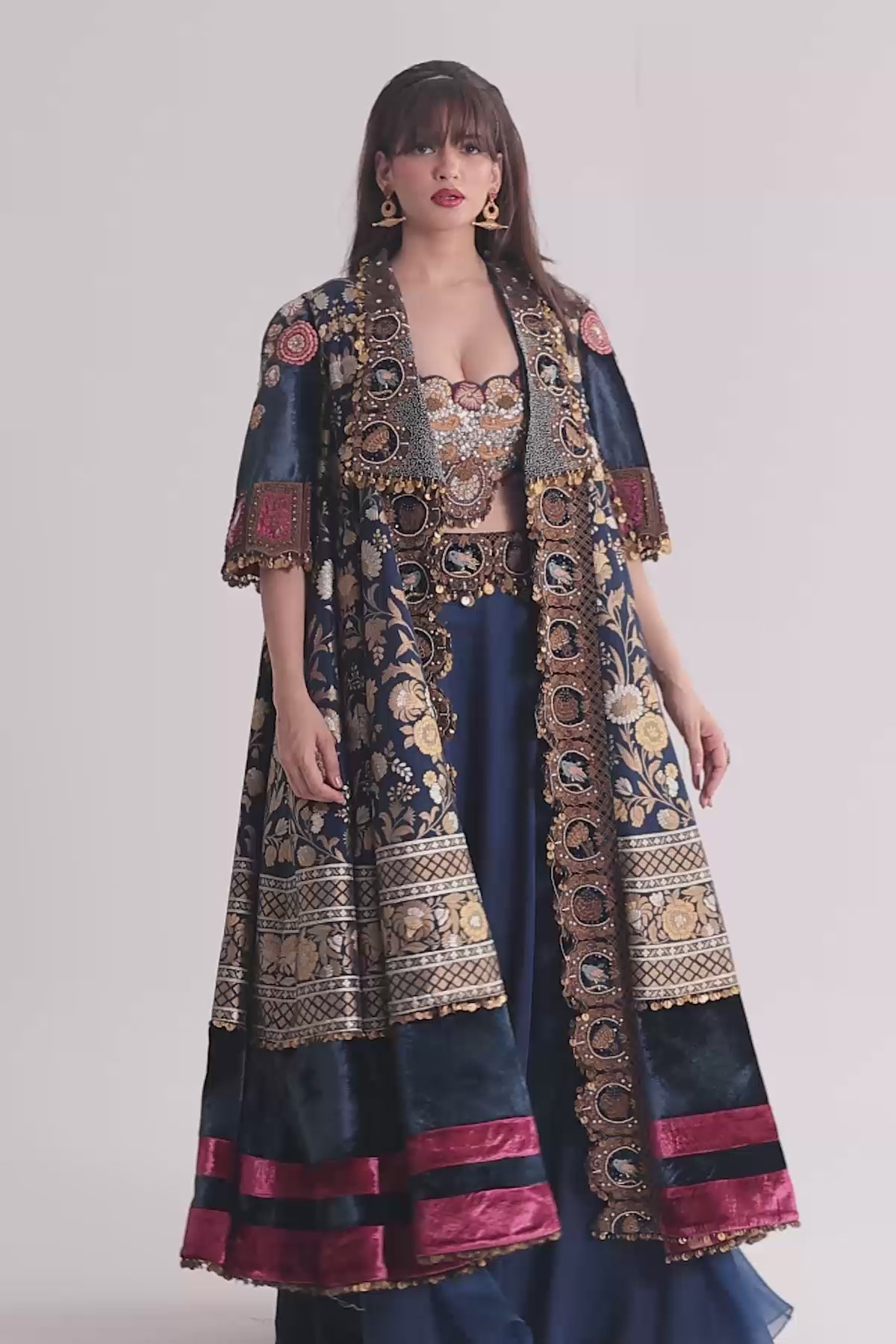 Mulmul lehenga skirt embellised with hand embroidery paired with an velvet embroidered bustier comes with organza cape
