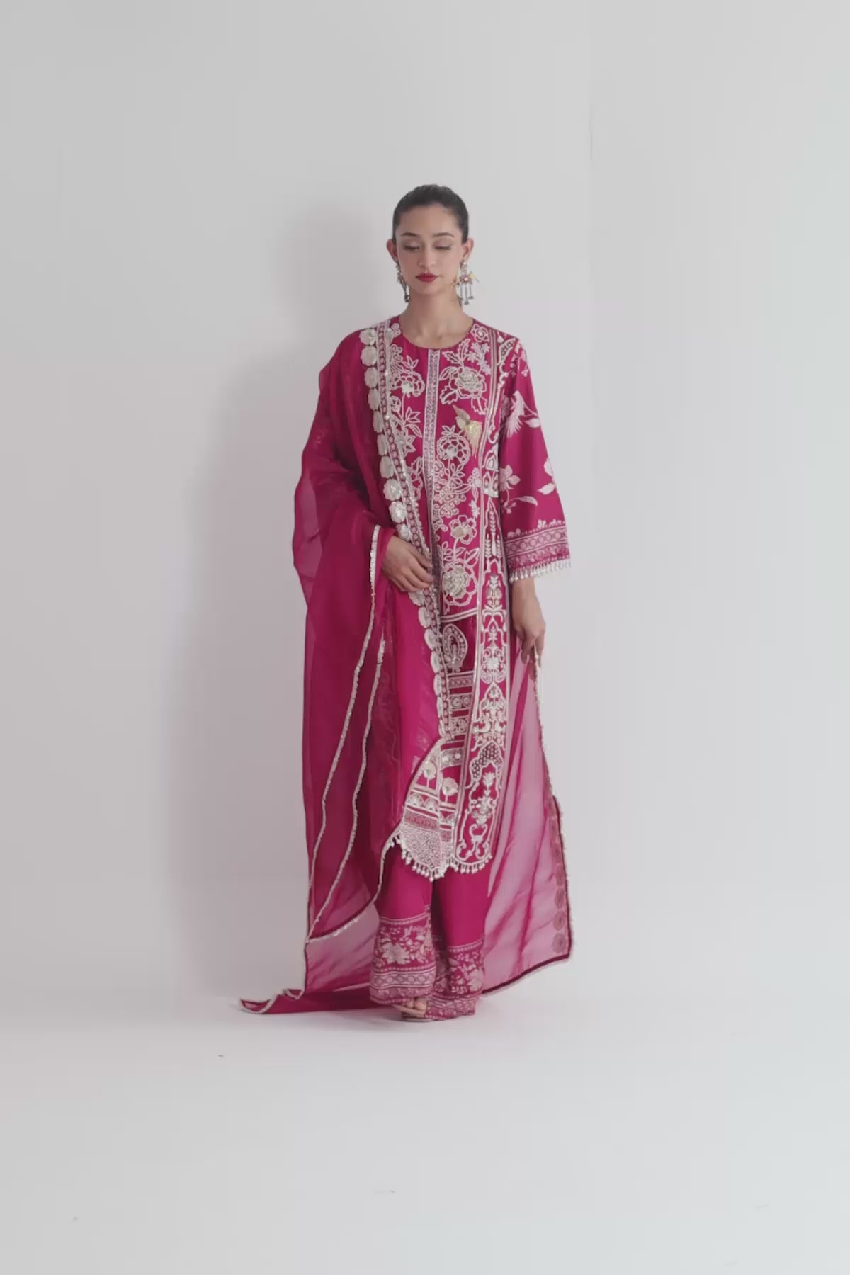 Printed embroidered dupion silk kurta paired with plain dupion silk pants featuring an embroidered border, and an organza dupatta with delicate embroidered border