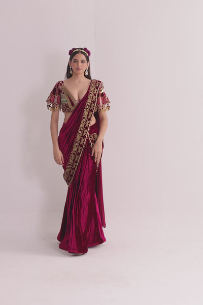 Velvet mermaid saree paired with an embroidered velvet blouse and dupion silk sleeves