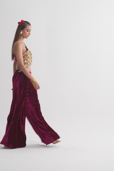 One shoulder embroidered velvet top paired with velvet pleated pants