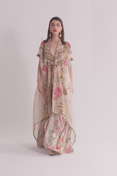 Embroidered Organza Cape Paired With Embroidered Silk Bustier With Printed Silk Drape Skirt