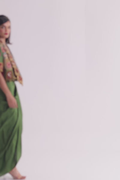 Embroidered dupion silk overlap jacket paired with an dupion silk drape skirt