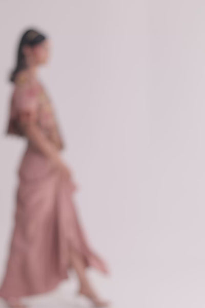 Embroidered dupion silk overlap jacket paired with an dupion silk drape skirt