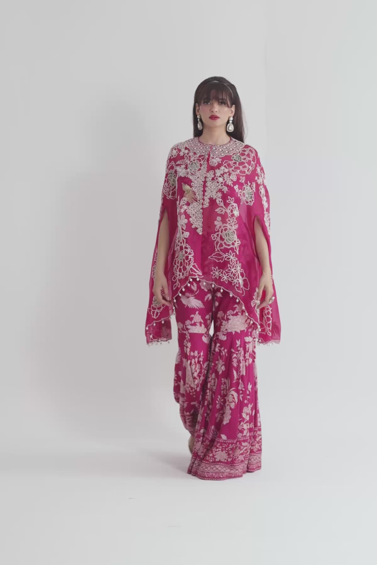 Embroidered organza cape paired with a printed mulmul gharara and a plain mulmul bustier