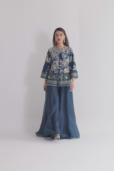 Printed dupion silk shirt with embroidery, paired with a plain organza sharara.