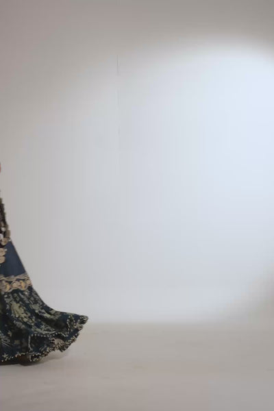 Raw silk printed blouse with hand embroidery, paired with a dupion silk sharara saree. Finished with a velvet palla and printed mulmul frill detailing
