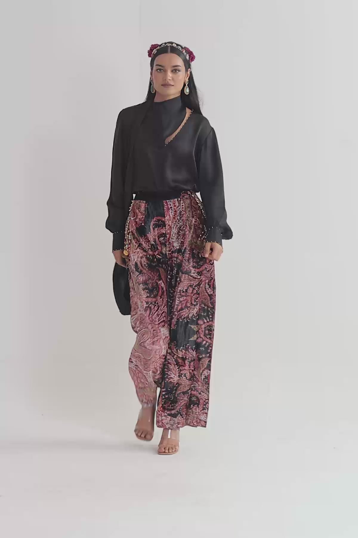 Satin shirt paired up with printed velvet trouser with embroidery details on pocket
