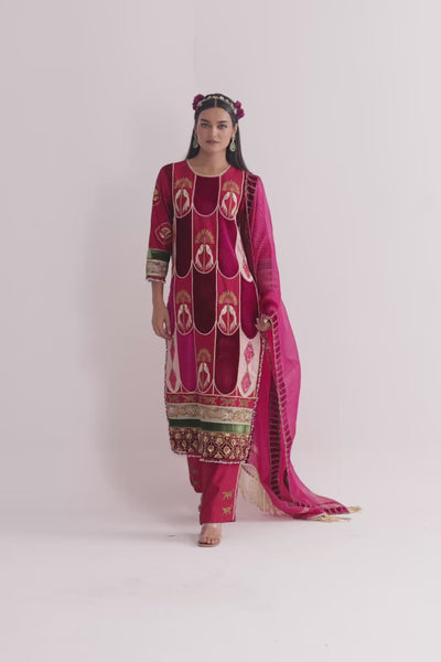 Dupion silk patchwork suit paired with dupion silk trousers and an organza dupatta
